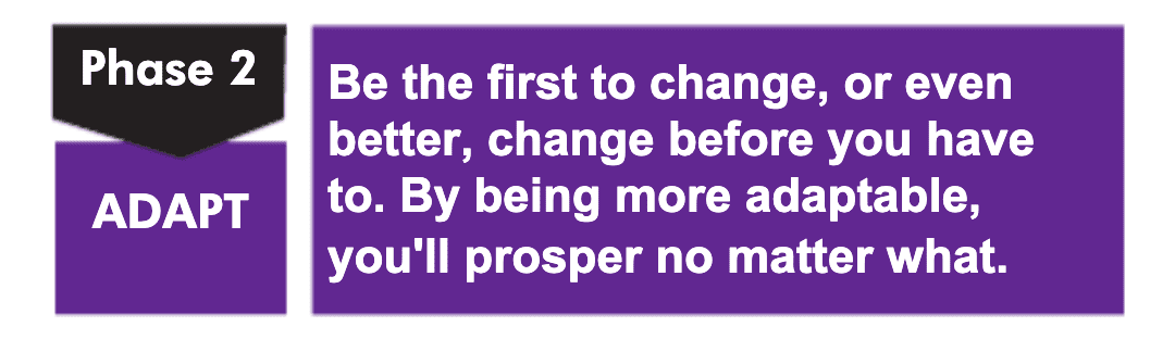 2. Phase 2 — Adapt. When things are changing, you often have more control than you think. Always view change as an opportunity to be freed of the thing you don't like about the status quo. Change before you must, and get in the vanguard of working your future job. Work the options and go where they lead with energy and enthusiasm. Make it your goal to be the first to change, not the last.