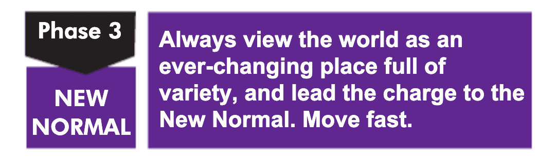 3. Phase 3 — New normal. You have to create your "New Normal" whenever change arises. Don't jump to conclusions, or try and oversimplify. Lead the charge to the New Normal, whatever that may be. And don't view that as your destination either. It will simply be a place to plant your feet until it's time to jump again.